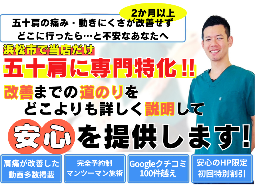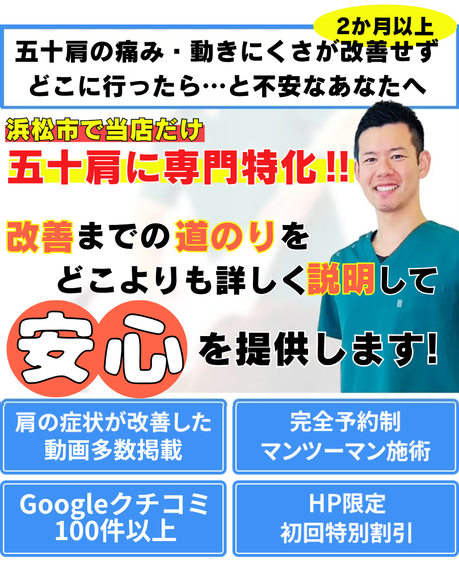 医師推薦!を謳っている整体院は数多くありますが、肩専門整体院である当店は、医師の学会でも講師を務め、全国でも活躍されている”肩専門医”が推薦する整体院です!10年間もの間一緒に働かせていただき学びで得た知識と肩関節疾患のリハビリの経験をしている肩専門整体院は浜松市…静岡県内でも当店唯一です!